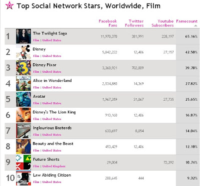 Los casi 12 millones de fans en facebook, sumados a los más de 380.000 seguidores en Twitter y alrededor de 228 000 en youtube, le garantizan a la saga el primer puesto en la lista de las 20 principales categoría de películas , que incluye tanto las películas como los estudios.